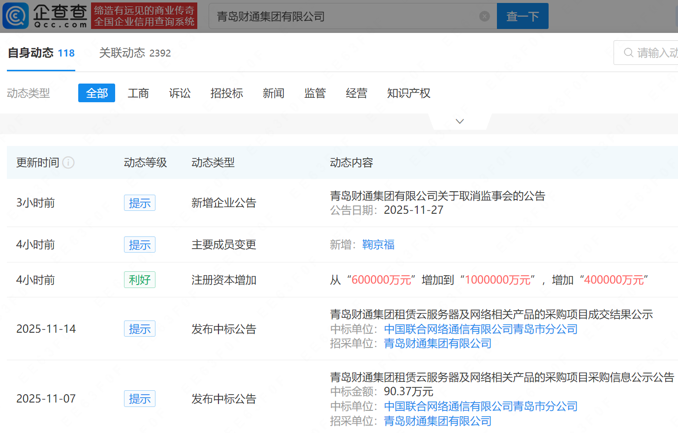 近日,青岛财通集团有限公司发生工商变更,注册资本由60亿增至100亿元智云理财,增幅约67%。企查查信息显示,该公司成立于2020年9月,法定代表人王振海,经营范围包含资产及股权的投资与并购、运营与管理等,由青岛市财政局全资持股。